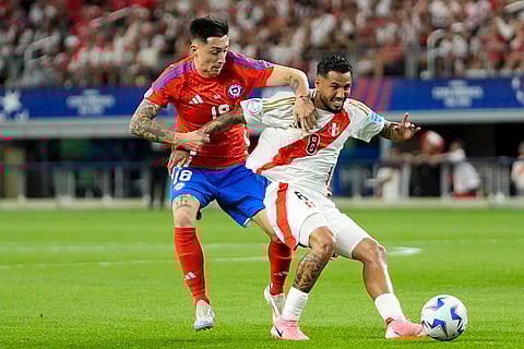 Diego Valdez de Chile, izquierda, y Andy Polo de Perú luchan por el balón durante el partido de fútbol del Grupo A de la Copa América en Arlington, Texas.