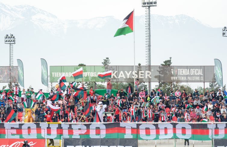 El Club Deportivo Palestino, un equipo de fútbol, juega con uniformes blancos, verdes y rojos. En su estadio ondean banderas palestinas y su club deportivo comunitario tiene una piscina al aire libre con la forma de la Palestina anterior a 1948. Pero este equipo de fútbol no juega en Palestina ni siquiera en Oriente Medio. Llamado Palestino, en realidad juega en la Primera División de Chile, la liga de fútbol más importante de Chile.